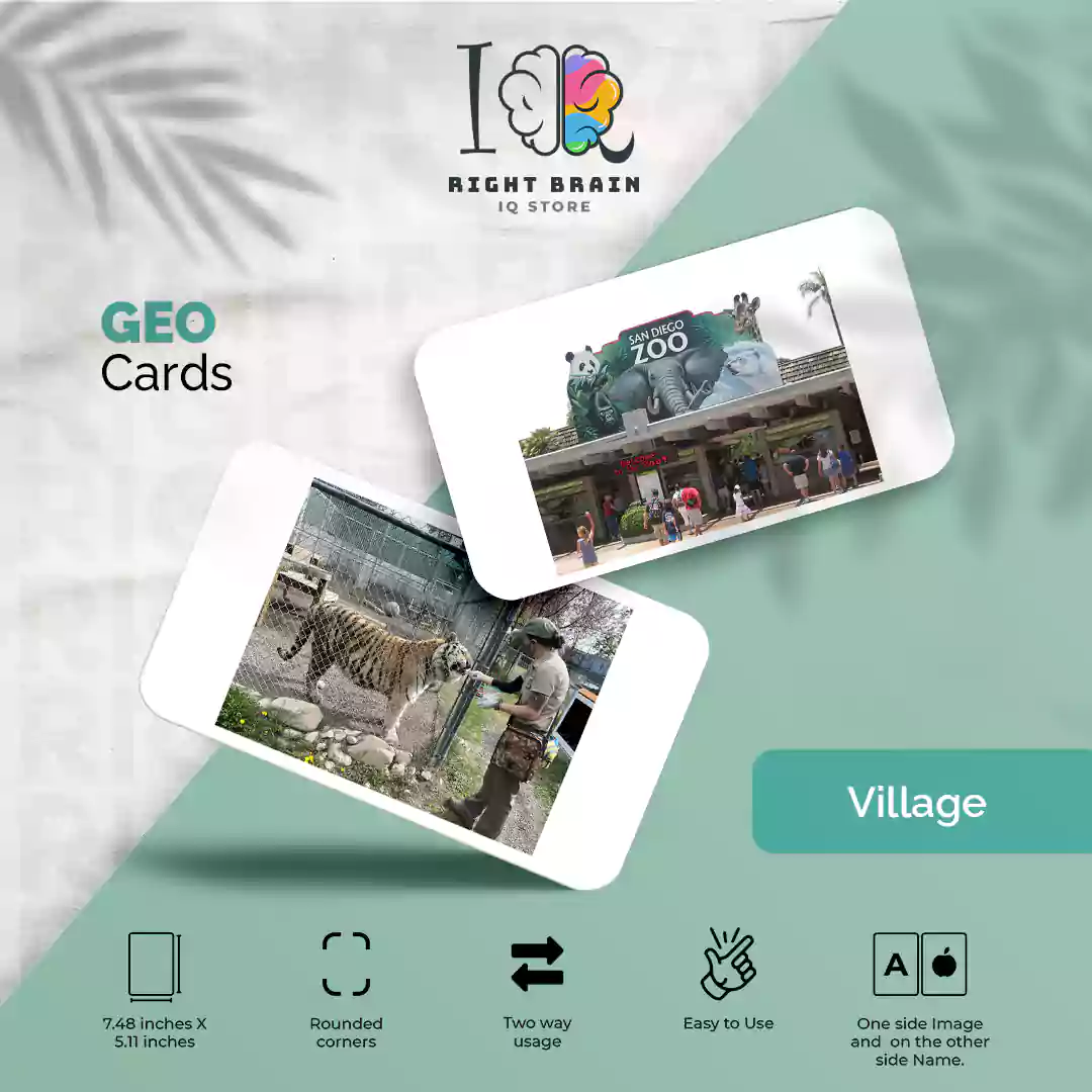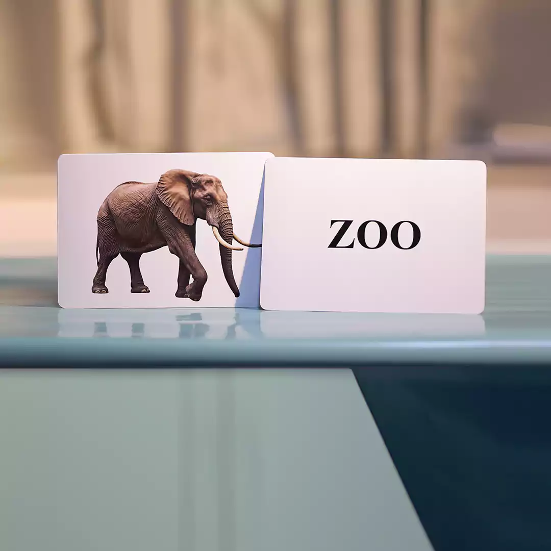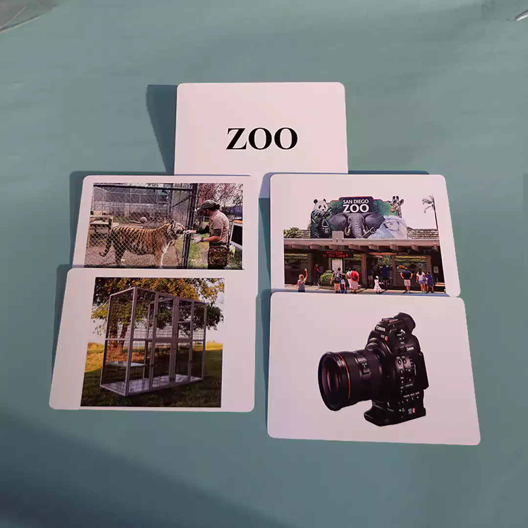 High-Quality Flash Cards: Images of zoo animals and habitats.